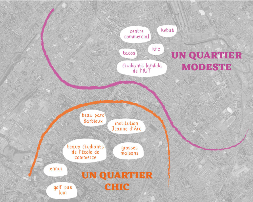 Creil, grand centre de la métallurgie et de la construction automobile qui a accueilli de très nombreux ouvriers dans les années 60 (juste avant l’effondrement industriel…). On compte 2 églises, 5 mosquées, 1 temple et 1 synagogue. En face de Creil : Chantilly, Senlis, Saint-Nicolas d’Acy, leurs hippodromes, leurs parcours de golf, leurs belles forêts et leurs noms à particule.